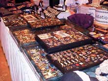 (ところ狭しと並べられたピンズ。 カジノチップにラミネート、キーホルダー他、あらゆるHRCグッズが揃う!)