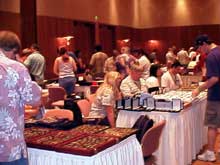 会場全体のイメージを見てもらおうと、ハードロックホテルのニュースレターから画像を借りてきました。 ちなみにドレとは言いませんが、私も思いっきり写っています(笑)。 この写真はキングピン(主催者)のテーブルから撮影されたもので、左の壁側中央にあるヘリントン(ぬいぐるみ)のブースでは古い熊や発売前のビーニーなどが展示されていて、これには写っていませんが右の手前にあったGCIのテーブルには非売品のピンがたくさん並べられていました。 写真では奥行きがよくわからないのがとても残念ですが、実際の会場は皆さんの想像よりもはるかに広いのですよ。 遠くにF大先生がレアピンを物色してるのが見えますか? ガールピンのトレードにチャレンジするみっきー、英語に頼らずボディランゲージでピンをGETしていくリサ、初参加のナツ&アサ夫婦もどこかに写っているのでしょう。 ギャン娘。はいないかも、昼間っからスロットで遊んでたからね (何しに来たんだ)。